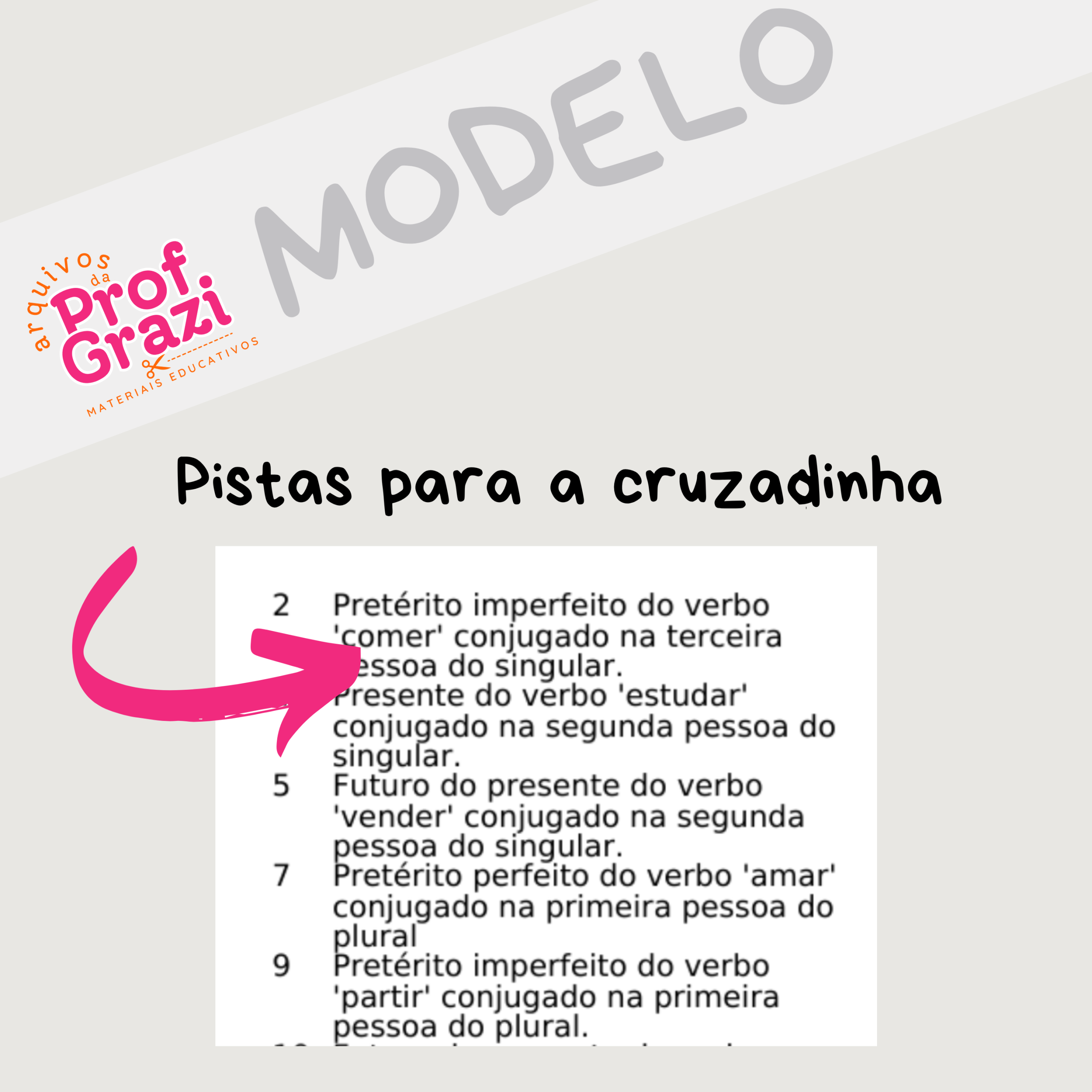 ✅ 1 cruzadinha temática, ideal para usar como revisão ou atividade avaliativa – o aluno deve completar o quadro a partir das dicas (como: pretérito imperfeito do verbo “comer”, conjugado na 3ª pessoa do singular → resposta: comia)